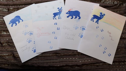 Make your own greeting card featuring a deer or polar bear and their snowy footprints. Explore real and replica objects like a red deer antler, polar bear skull, and animal tracks.